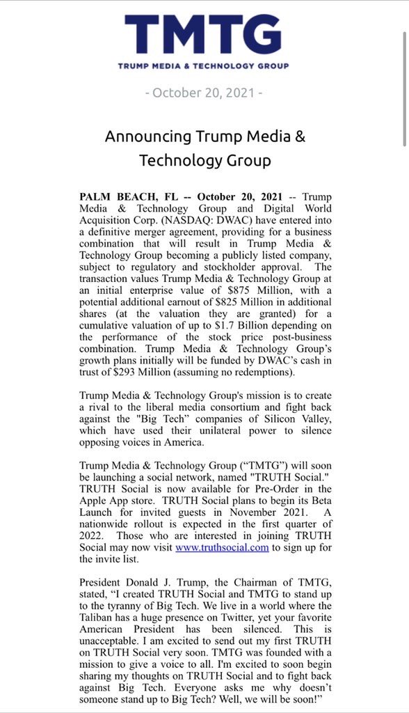 Former President Trump on Wednesday announced plans to launch a social media network called Truth Social and said that it would go public via a SPAC. Most ex-presidents are focused on their legacies by creating presidential libraries or engaging in philanthropic. TRUTH Social plans to begin its Beta Launch for invited guests in November 2021.